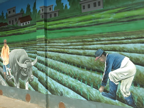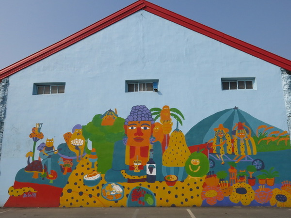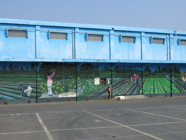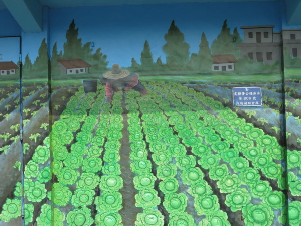 將車開進後方停車場,首先看到的便是具有一甲子歲月的穀倉群彩繪壁畫。