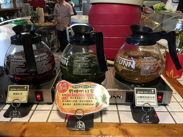 自助吧檯上提供三種飲品,錫蘭紅茶、有機明日葉茶及有機烘培黃豆茶,我們很喜歡清爽的明日葉茶。