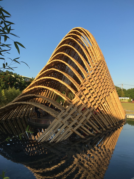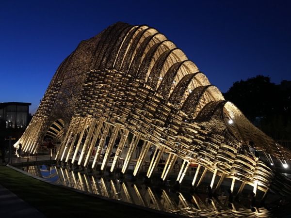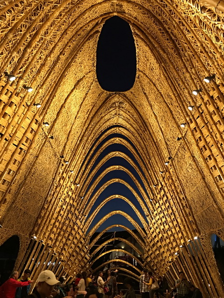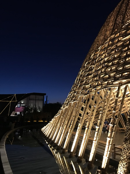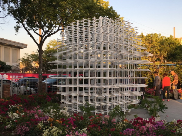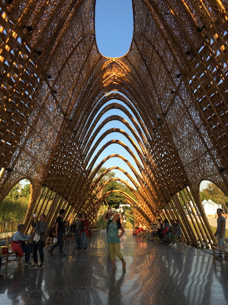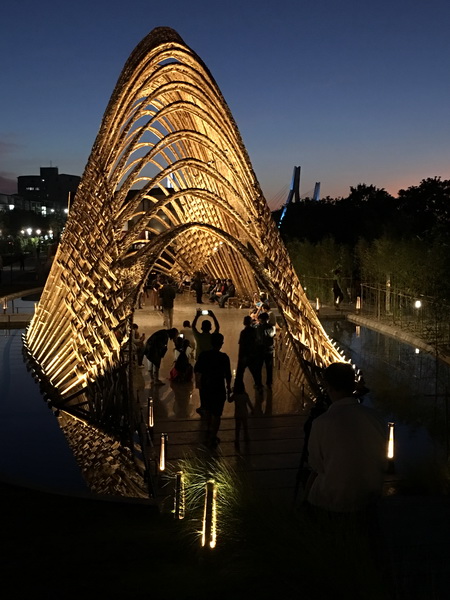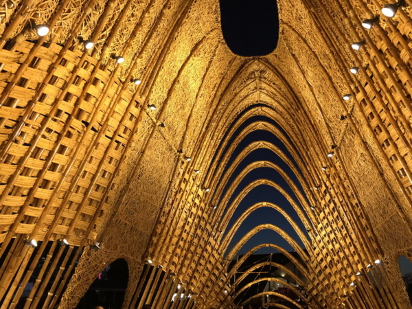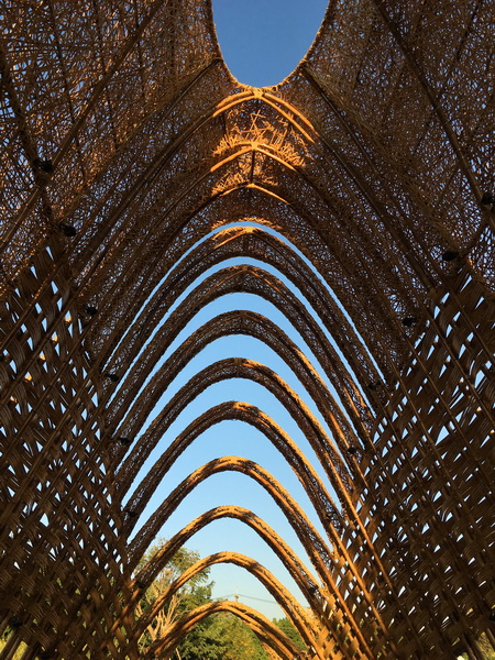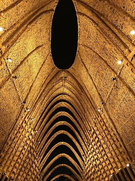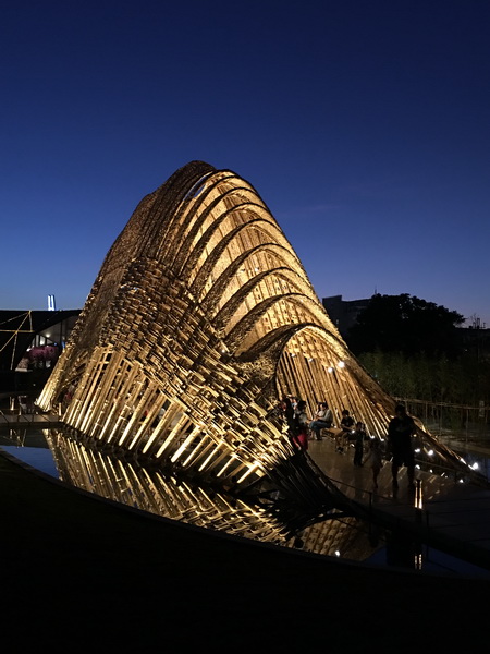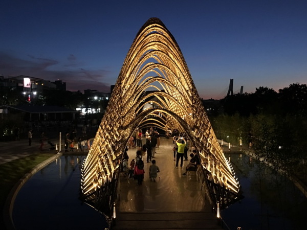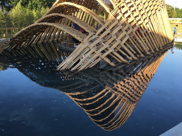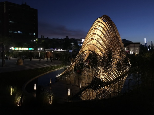竹跡館,據說概念取自種子、竹林及中央山脈等意象設計而成,建築結構與編織呈現竹森林型態,不同角度有不同的幾何線條構成視覺上特殊的美感。
