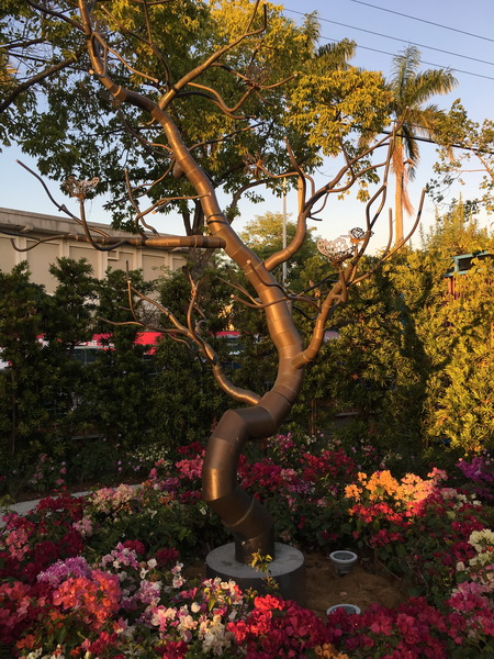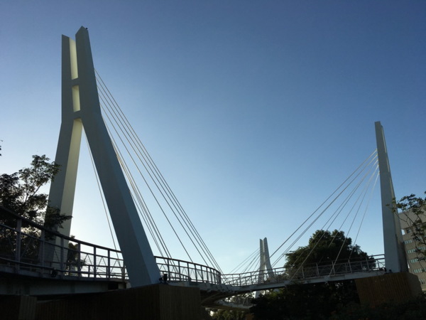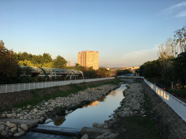 走上螺旋跨橋四,遠眺河道,兩側綠樹成蔭,步道種植許多花草樹木,利用原先的樹木加以設計規劃,散步其中想來也相當愜意。