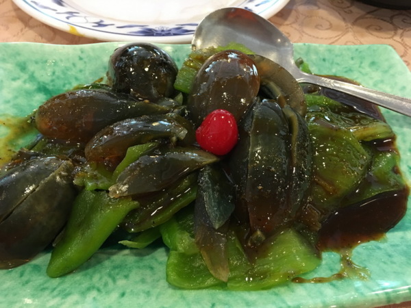 手工狗臭屁,是餐廳的招牌菜之一,青椒烤過後剝皮冰鎮,涼拌皮蛋,口感爽脆。