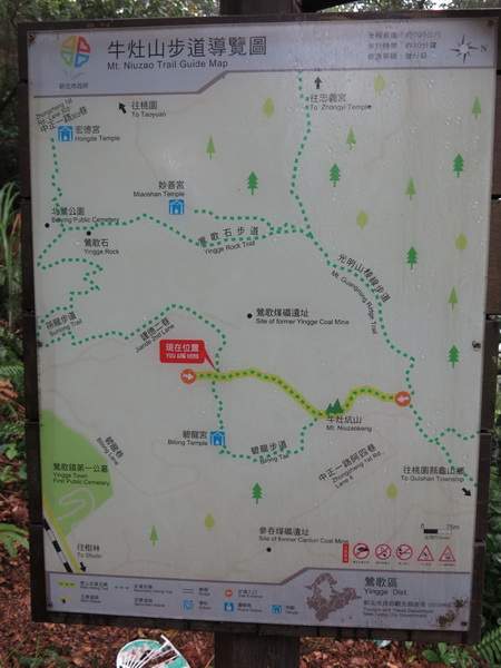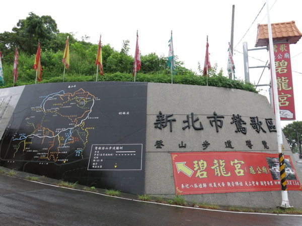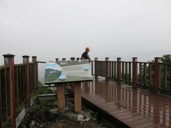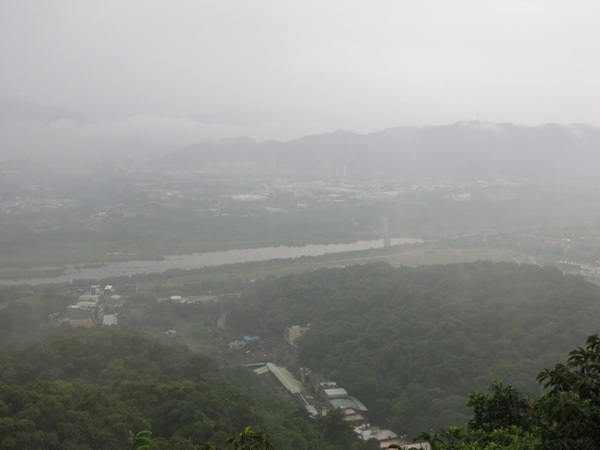 09:36 與牛灶山步道交叉點,取右上牛灶山觀景台,左方可遠眺雄偉的碧龍宮,可惜今日下雨,景點有朦朧的美,遠方亦可見大漢溪及鶯歌火車站。