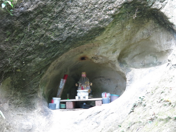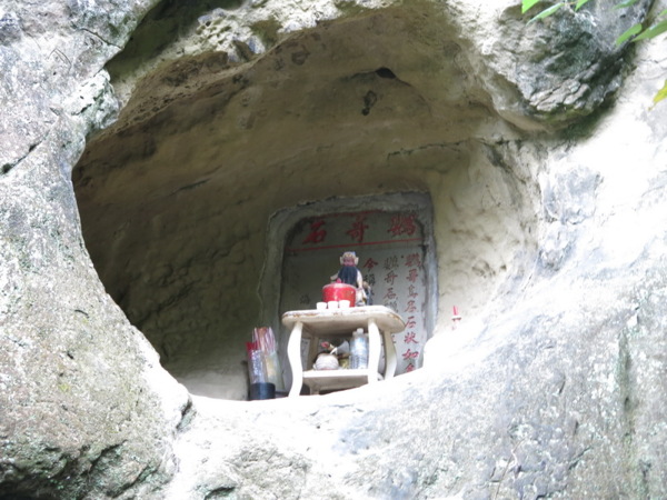 對面鶯歌石岩壁有凹凸不平的坑洞,上方有供奉神像,傳說洞中曾發現貝塚化石,洞內還有一塊日據時代昭和二年(1927年)豎立的石碑,寫著「鸚哥石」,可惜石碑的碑文被神像擋住,無法一睹全貌。
