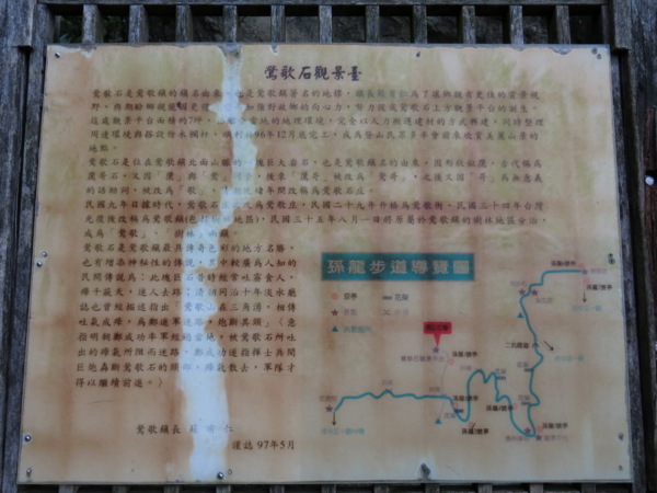 第一次來鶯歌爬山,選擇了一條比較大眾化的健行步道—「孫龍步道」,順便繞道探訪著名的鶯歌石。步道是民國76年(1987年)闢建的,全長約2公里,是早期運煤的臺車道路改建而成,沿途綠意盎然,大部分路況都平緩好走,途中經過的「二坑隧道」,別具地方歷史意義,沿途的涼亭眾多,展望良好,加上著名的地標「鶯歌石」,是一條充滿傳奇色彩,老幼皆宜的大眾化路線。只有末段要到碧龍宮時陡峭些,而步道兩端的出口和二坑隧道附近皆有道路通往中正一路和鶯歌火車站,交通十分方便。