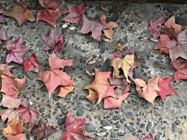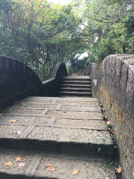 拾階而下,兩旁楓樹間雜其中,深秋之際,階梯佈滿紅色落葉。
