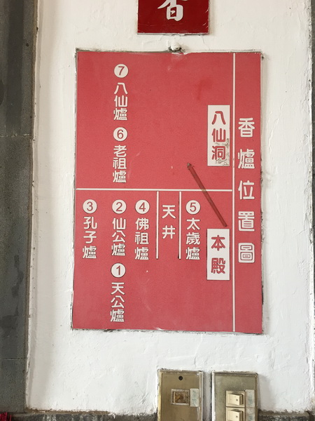 殿內主祀孚佑帝君(呂洞賓)、釋迦牟尼和孔子。