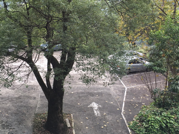 階梯旁洩水道內佈滿厚厚的落葉。