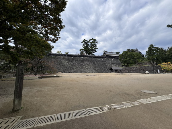 大手前,一進入就會發現置身於一個巨大的長方形廣場,映入眼簾的是後方高13米的巨大石牆,也是松江城最高的城牆。透過上面建造的城牆之間的縫隙,可以清楚地看到攻擊會從上面傾瀉而下,從這裡可以看到入口處是有防禦工事的。