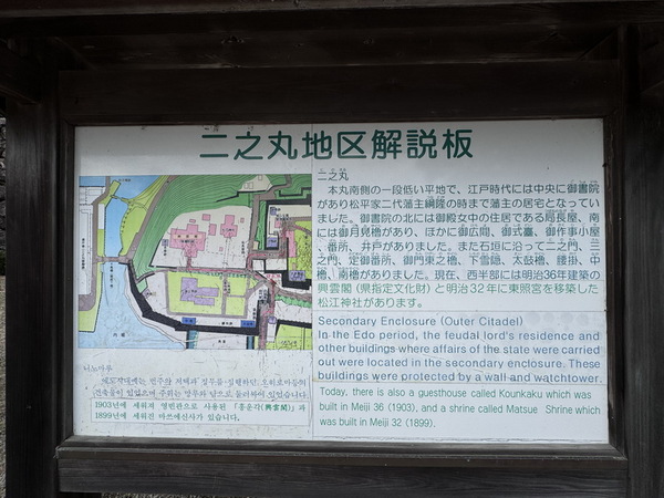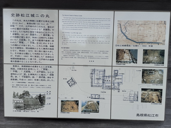 在日本的城廓建築中,「二之丸」是僅次於「本丸」(即天守所在的核心區域)的第二層防衛與行政中樞。松江城的二之丸過去是重要的政務、生活與接待空間,也是連接本丸與外部城區的交通要道,原有的建築大多已不存在,但遺跡地基仍可推測出當時的建築規模與配置。這裡還設有解說看板與平面圖示,說明二之丸建築群的樣貌。