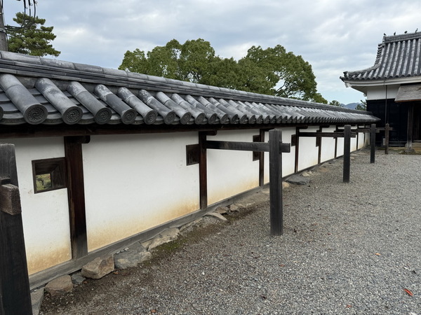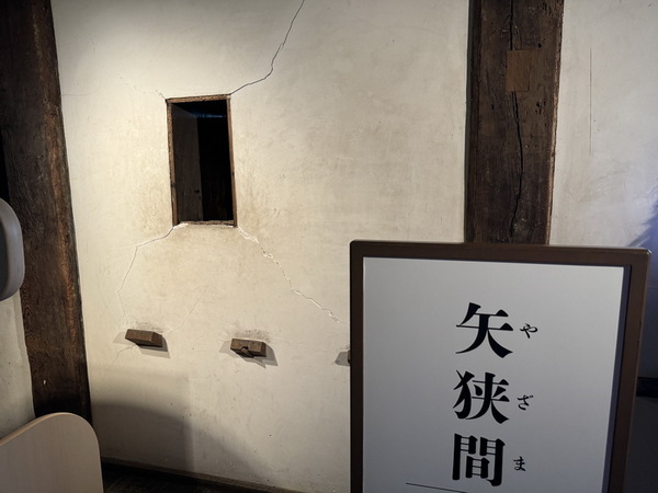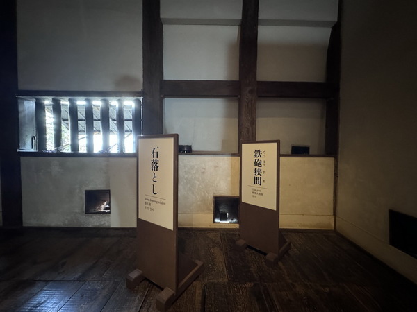 設有「石落(いしおとし)」的小孔洞,用來從樓內丟石頭或熱水擊退入侵者,及「狭間(さま)」開口,牆面設有狹窄縫隙,可讓弓箭或火繩槍對外攻擊,外人難以反擊。