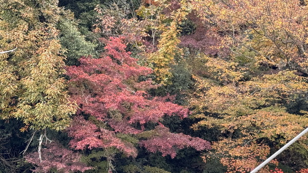 對面纜車平行前進,穿梭在繽紛色彩的楓葉間。