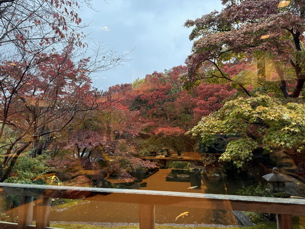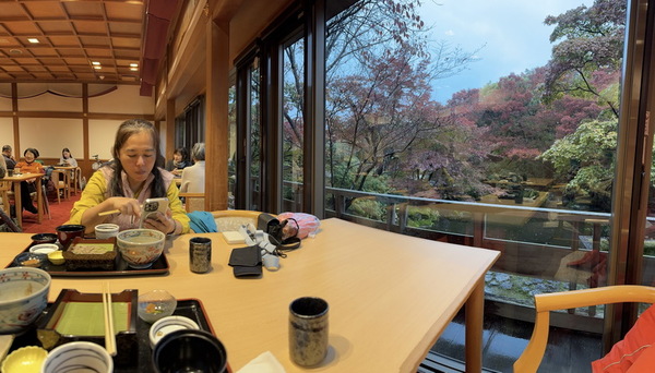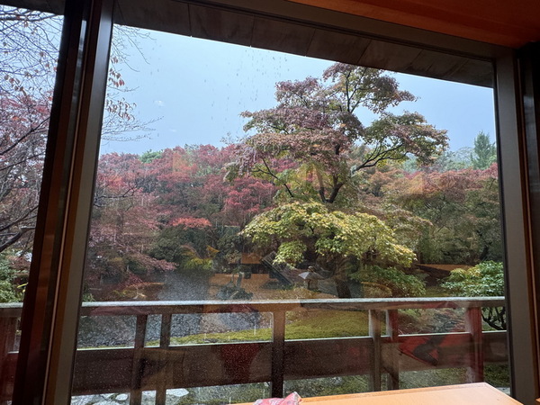 雖然今日因天候不佳,下起大雨,並不影響我們用餐賞景的興致。這裡不僅能享用日式料理,還能透過窗邊欣賞庭園景色,用餐氛圍特別愜意。店內每個座位都能眺望庭園的綠意流水,欣賞美景。與外面的觀光人潮相比,這裡氣氛寧靜悠閒,適合慢慢品味。