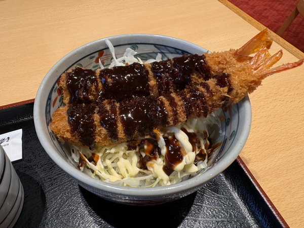 炸蝦丼飯,大蝦炸得外酥內嫩,淋上特製醬汁,搭配底下的高麗菜絲與米飯,口感清爽。