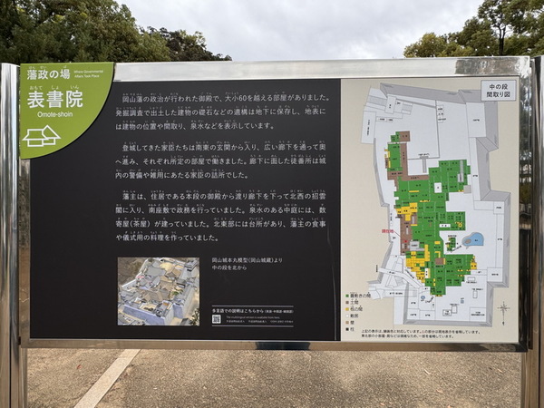 表書院,是岡山城主用來接見重要客人或舉辦正式儀式的場所,也被稱為「廉政之場」。地上還標示了舊址每個空間的過去用途,讓遊客一目了然建築物的歷史遺跡。