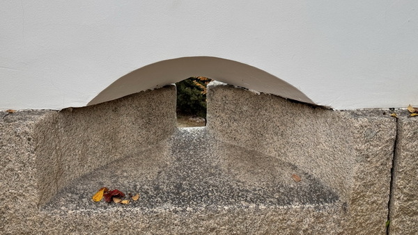月見櫓之石桓上的凹槽溝「石樋」,依據這樣的方形凹槽依形狀與位置,可能是為了防止雨水積聚導致石垣鬆動、崩壞,這些孔通常以石塊疊出中空結構,讓雨水能從城內或天守台流出。