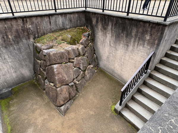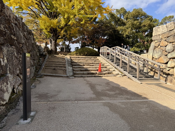 鐵門跡,鐵門曾是連接本丸與天守的重要防禦門,以厚重的鐵包木結構打造,堅固無比。如今僅存石基,但從其遺跡仍可想像當年城防的嚴密設計。門口位置視野開闊,是攻防要地,現今成為遊客通往天守的必經之路之一。站在鐵門跡,可以同時看到天守閣與旭川景觀。