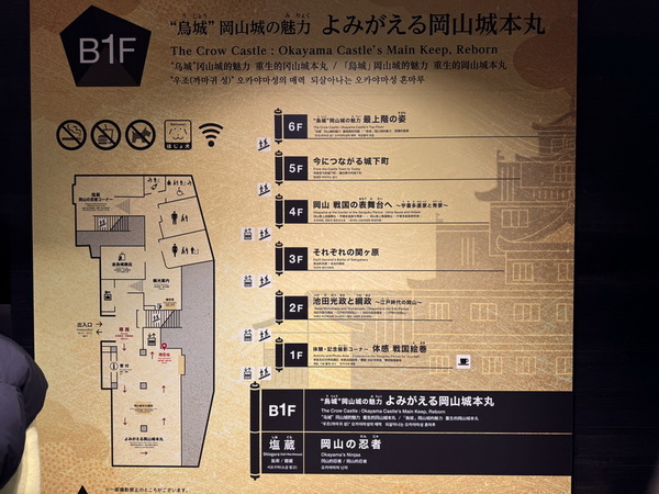 如今的天守閣於2022年全新整修完工,從入口進入B1到最高頂樓的6F,每一層都有不同的展覽主題,帶領遊客了解岡山城與岡山市的歷史及變化。建議可以順著路線從B1層參觀,之後直接坐電梯到6樓,再慢慢走樓梯逛下來,是最省力也最順暢。