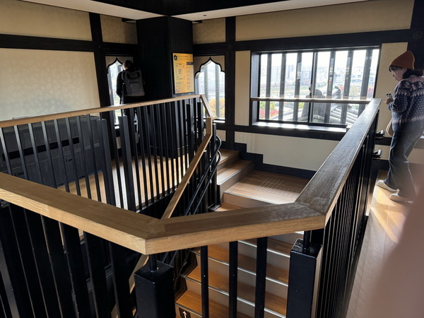 接著搭電梯,上到6樓,重新修復的天守頂樓,因為耐震結構以及安全性的設計,在4個角都設置了柱子,而中央則設置了較為寬大的樓梯。