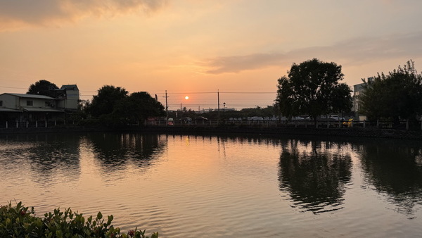 傍晚時分,夕陽灑在池面上,金光閃耀,景色柔和溫潤。