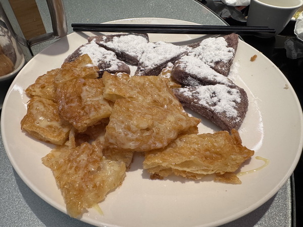 甜點—雲南雙寶(雲南甩餅+雲南粑粑),有兩道甜品,是道創意雙拼甜點,雲南粑粑外皮酥脆、內餡甜潤,撒上糖粉後咬起來很紮實,帶有紫糯米的香氣;雲南甩餅沾著煉乳每,口感Q彈、層次豐富,兩者甜鹹交錯。