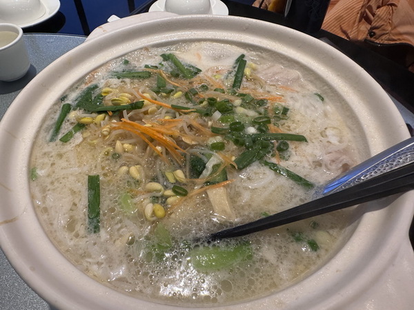 過橋米線,招牌菜之一,湯頭清爽鮮甜、手工米線Q彈滑順,搭配豆芽菜、肉片與紅蘿蔔等豐富配料,是正統的雲南口味代表。