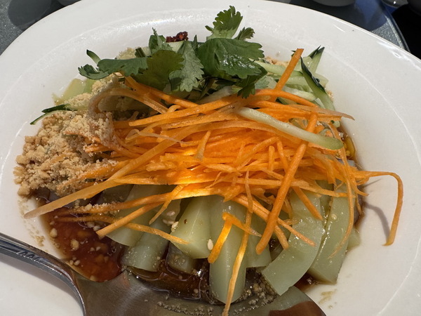 冷拌雲南豌豆粉,清爽的涼拌料理,碗豆粉搭配米醋醬、芝麻、香油、花生碎、香菜、紅蘿蔔絲、小黃瓜絲和辣油等雲南風味的佐料涼拌而成,滑嫩有彈性,吃起來酸、辣、香麻,風味濃郁,是雲南常見的開胃小菜。