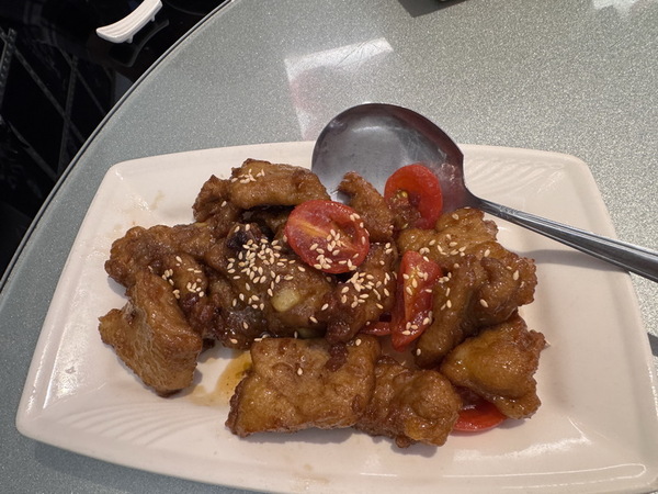 涼拌炸雞蛋,簡單的食材,新鮮牛番茄、蛋、青蔥,紅蘿蔔、小黃瓜相搭配,雞蛋炸到邊緣酥脆,但嫩度掌握的很剛好,淋上泰式開胃醬有魚露、檸檬汁、砂糖加上開水調開的獨特醬汁,這道料理酸酸甜甜,非常清爽。