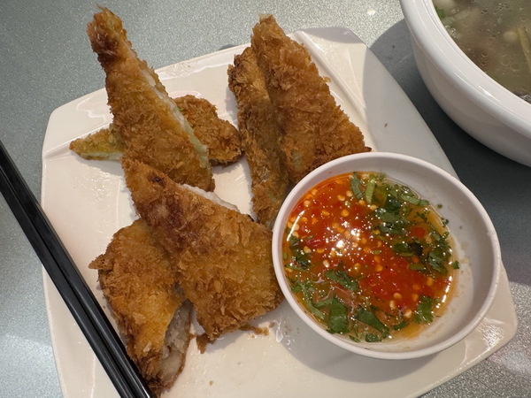 酥炸海鮮卷,外皮炸得酥脆好吃,內餡的蝦仁及花枝塊很有彈性,和爽口的高麗菜搭配,多層口感,沾美乃滋或是酸甜醬都好吃。