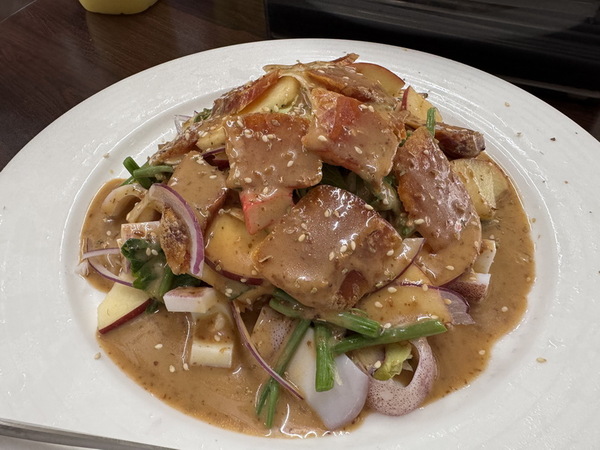 這次的用餐從清爽開胃的前菜「和風烏魚子海鮮生菜沙拉」開始,新鮮生菜搭配Q彈海鮮與鹹香的烏魚子,再淋上微鹹甜的和風醬,口感層次分明,清爽開胃。