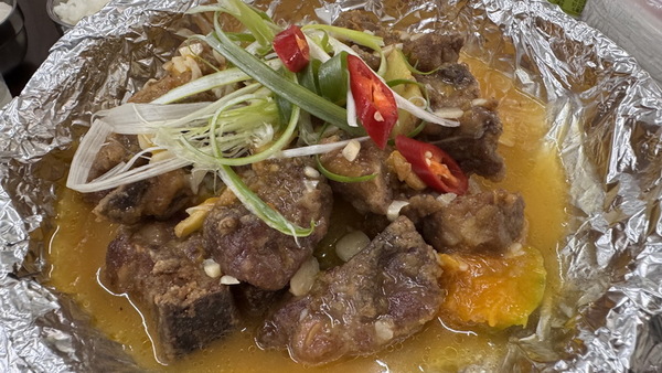 南瓜粉蒸排骨,鬆軟綿密的南瓜融合排骨的肉香,蒸得入味卻不油膩,充滿自然的甜味。