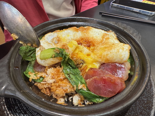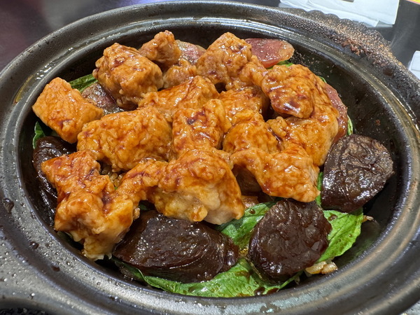 最後是「滑雞臘腸煲仔飯」,結合了嫩滑雞腿與經典臘腸的雙重配料,雞肉的鮮嫩與臘腸的鹹香完美平衡,既有肉汁的清甜,又有臘味的濃郁。米飯粒粒分明、香氣四溢,是一道非常耐吃且不易膩口的選擇。