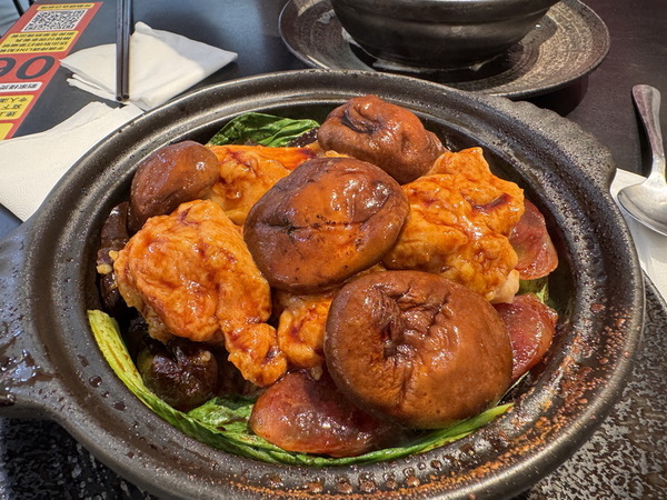 首先是「仙菇滑雞煲仔飯」,一掀開鍋蓋,熱氣裊裊升起,香氣撲鼻而來。去骨雞腿肉滑嫩多汁,搭配仙菇的淡雅香氣,層次豐富。鋪在飯上的肝腸與臘腸,油脂隨著熱氣慢慢滲入米飯之中,帶著鹹香與微甜的經典港式風味。鍋底還藏著微微焦脆的鍋巴,增添口感的驚喜。