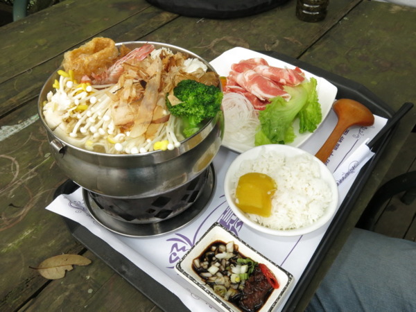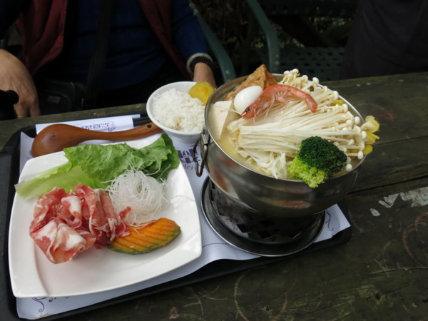 日式高湯火鍋,口味較清淡,滿滿的火鍋料,多到看不到湯底。另外付了菜肉盤,一碗地瓜白飯。