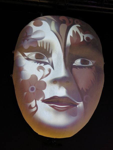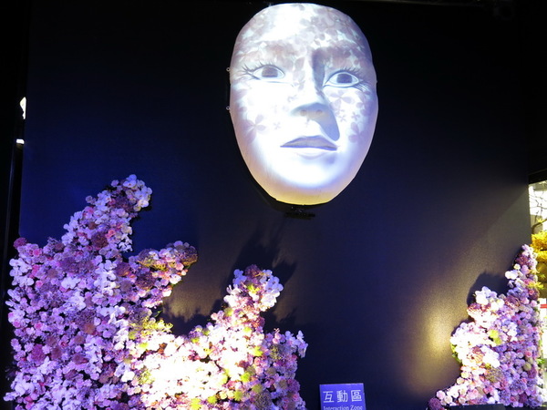 由長形地面走道的花卉投影,到牆面大大的白色人面五官面具,透過與遊客的互動遊戲及燈光投射,產生另類的花藝展現,新奇有趣。
