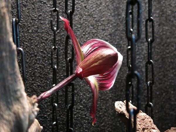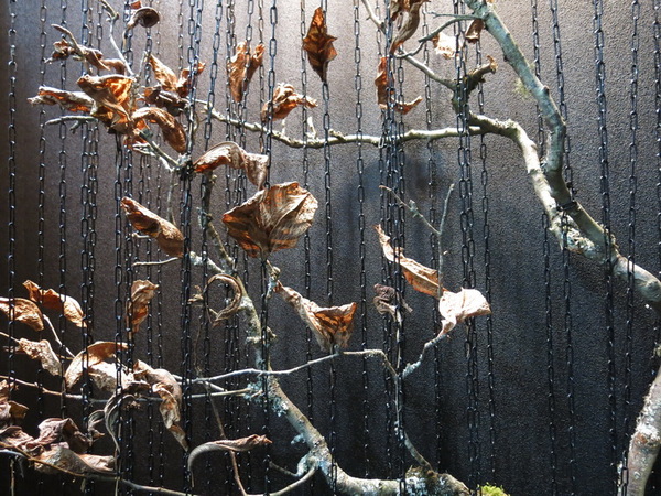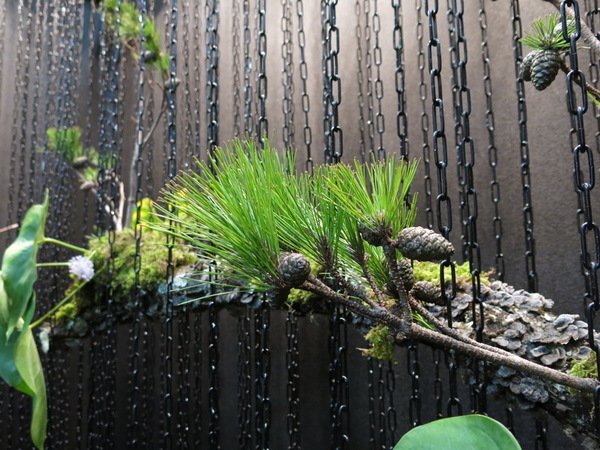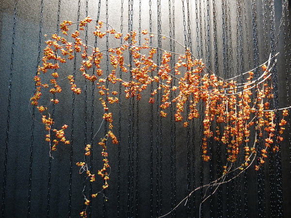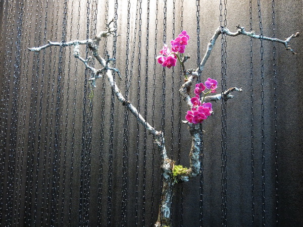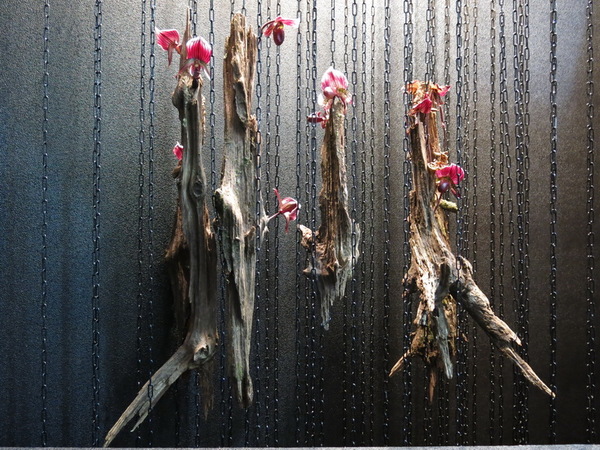 花田小憩植物美學花藝展區,黑色粗砂牆面、垂放的黑色鐵鍊,極簡風的單一花卉搭配枯木或枝條,凸顯色彩的豔度,反而給人一種寧靜沉穩的感覺。
