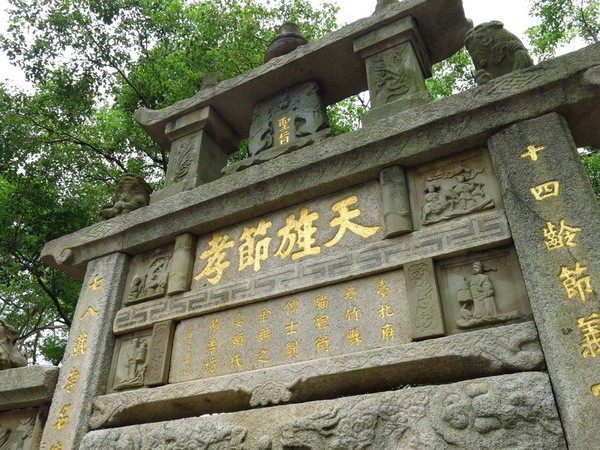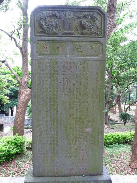 節孝坊後方另有兩座天旌節孝牌,一為日治時期所立,碑額雕刻雙龍拱菊花與聖旨的紋飾,顯現日本獨有的特色。