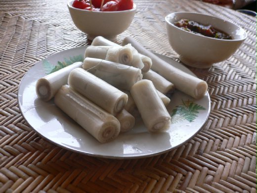 第二盤,是今天的主角,香蕉莖,就是把香蕉莖的外皮剝掉,留下中間白白的心,在沾上他們特有的沾醬,超級好吃的,一口咬下去,還會牽絲,酸酸甜甜的,非常美味,且在如此炎熱的「冬天」,最適合吃那個啦!