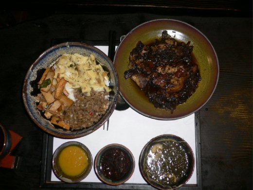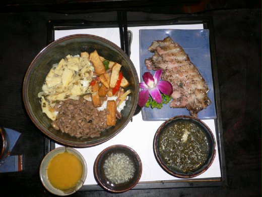 走進裡面,裝潢的古色古香,很有氣氛喔!杯墊、餐具袋等,都是客家的相關文物。我們點了梅干扣肉飯、鹹豬肉飯、和兩份茄香雞蓉板條。原本我是吃茄香雞蓉板條,但是叔叔用他的鹹豬肉跟我換,一開始,實在有一點不願意,因為整塊肉幾乎都是肥豬肉,看到就覺得恐怖,在我鼓起勇氣,夾起一塊放入口中,那種美妙的滋味,讓我一口接一口,奮力的扒飯。醃到恰到好處的豬肉,加上香Q的米飯,絕對讓你食指大動,如果在沾上一點澄醬,那種酸酸的滋味,一定讓你魂牽夢縈。