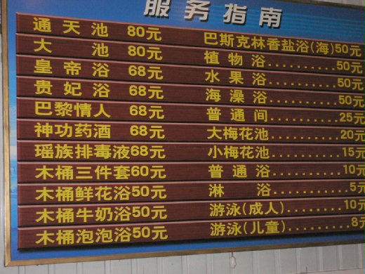 我們到了一家,看起來還不錯,還蠻乾淨的,且他們有分很多種湯,什麼巴黎情人(難道是有人陪你泡嗎?)、神功藥酒(怪異,是不是泡了以後會比較勇猛一點?)、通天池(泡了會升天嗎?),種種奇怪的湯,我之前去日本,都還沒有看過那麼怪的,但很不湊巧,他們裡面的人已經滿了,我們只好轉戰下一家,不然我還蠻想試試貴妃浴呢!(請不要聯想到楊貴妃)