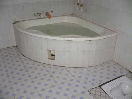 泡溫泉,是一人一間,聽起來好像不錯,但走進去就覺得怪。一走進去,先看到一張床,沒錯,貨真價實的床,在走過一道門,才看到與小便斗合併的泡澡間。有一點簡陋,且小便斗就在浴盆的旁邊,會讓人覺得不乾淨,跟日本真的不能比,不過還可以接受,由於我近視,霧濛濛的,啥都美啦!