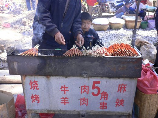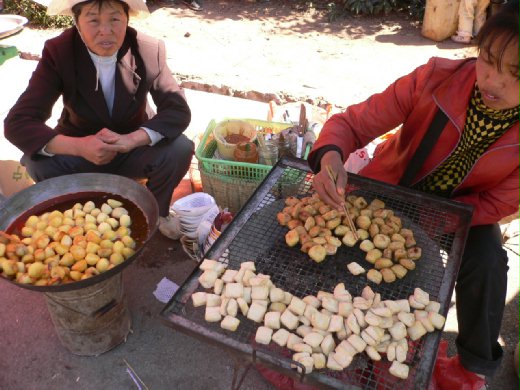 第二張照片是賣臭豆腐的小攤子,在雲南很多,但我在北京不曾看到過,非常好吃,他們的豆腐是用烤的,也不會臭,一包五角,有十顆。我們一開始只是抱著試試看的心態,但一試之下,驚為天人,一口接一口,不停的吃,雖然只有十顆,一下子就被搶個精光。烤的略黑的豆腐,灑上紅紅的粉,又辣又好吃,讓我這個不吃辣的人,也深深的喜愛他,回來台灣還念念不忘,一想到,口水就要留下來了。
