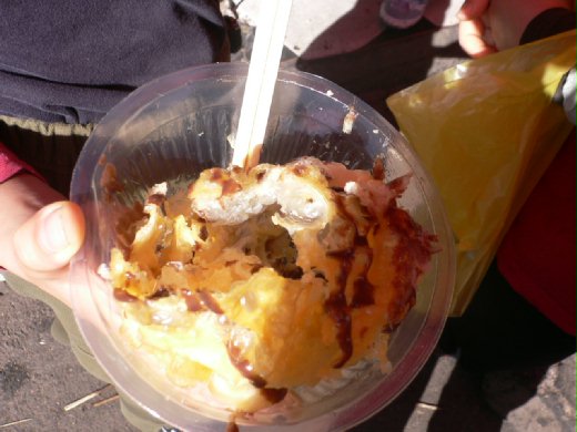 在那哩,又看到賣臭豆腐的店,二話不說,馬上又挑錢出買,還看到很奇怪的東西,我忘了名子,這是用牛奶加一些東西下去炸的,也可以選擇不要炸的,有很多種口味可以選,我選擇巧克力,吃一口,脆脆的,但有一點微酸,我覺得不是很好吃,可能是個人飲食習慣不同吧!