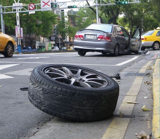 離開了賓士車身之後,小車的右前輪就賴在地上不走了,輪軸當然和輪圈、輪胎是同進退的,