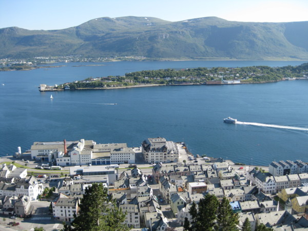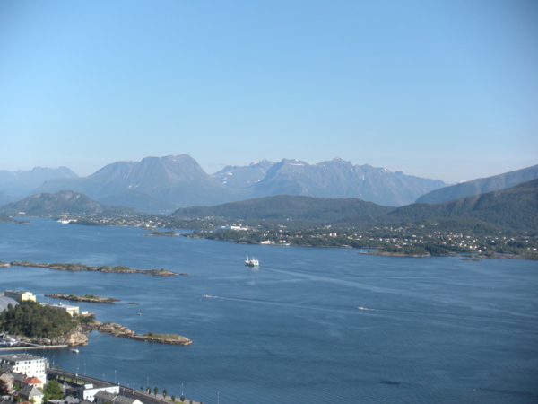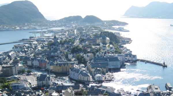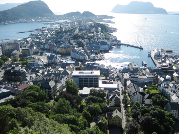 廣場上「醃魚婦人」雕像身後遠山頂端的建築,即Ålesund有名的Aksla,乃不容錯失的景點之一。由上俯瞰Ålesund猶如漂浮於水面的市容,繼以風和日麗氣候的加持,童話般誘人的景致應該就是如此吧!