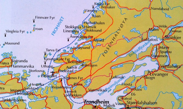 過了半晌,又聽聞領隊廣播:船舶現在航行經過Fosenhalvøya半島,右邊岸上一艘興建中的輪船幾週後將完工,而我們的「Midnatsol」和另一艘同型姊妹船「Trollfjord」(山妖峽灣)就是由對岸的工廠生產製造的。「午夜的太陽」路過家鄉大門而不入,循著峽灣面順勢繼續北行,逕自駛向Frohavet外海。