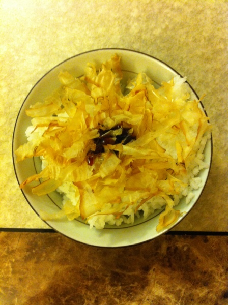 柴魚片在冒煙的白飯上漸漸成捲取狀,