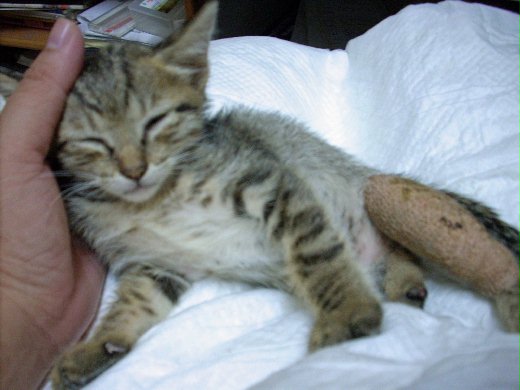 十幾天來,這隻灰狸虎班小母貓,先是因左後腳斷裂而有了石膏腿,後來又組織壞死萎縮,不得不截掉它的整隻尾巴,並拿掉牠斷裂的尾椎最後一節。如今,多次進出的醫院的結果,是已經花掉我六千多塊的費用,不過我也看開了,反正這半個月來我也破財破到沒了感覺(先是心痛自責,後來是認清自己根本是個白痴的事實),現在最令我擔心的是:沒有尾椎撐持的卡布奇諾,能否便便成功。