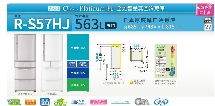 日立 HITACHI RS57HJ 563公升變頻五門冰箱 日本原裝進口
