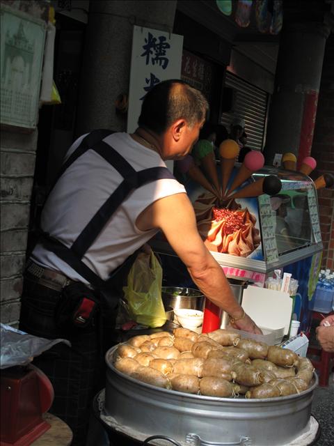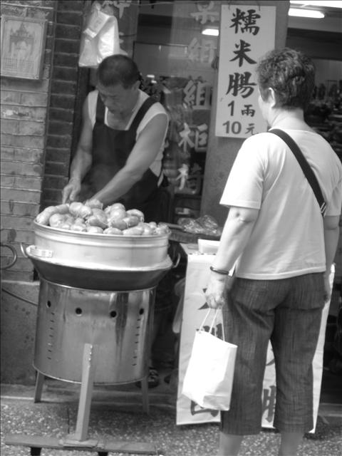 大小不定,胖瘦不齊,走過的人駐足看看。阿嬤最喜傳統食品,一過來就說:「一份。」老闆剪著腸子切成片狀,澆上醬油膏,灑些香芫荽,古老的懷舊氣息突然湧進心懷。