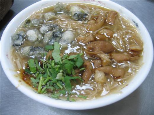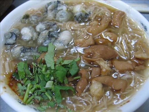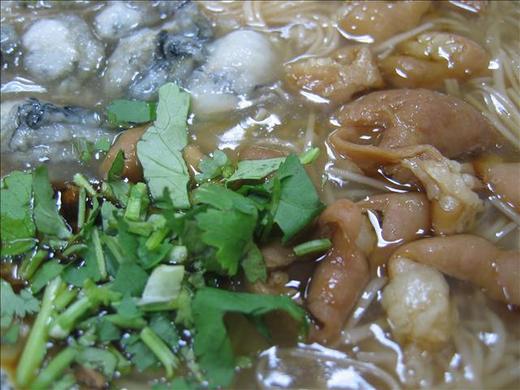 麵線端來,真嚇人,一堆蚵仔,一堆大腸,壁壘分明,三國鼎立。偎在一邊的芫荽,綠綠的青翠,點得褐黃麵線糊更加可口誘人。